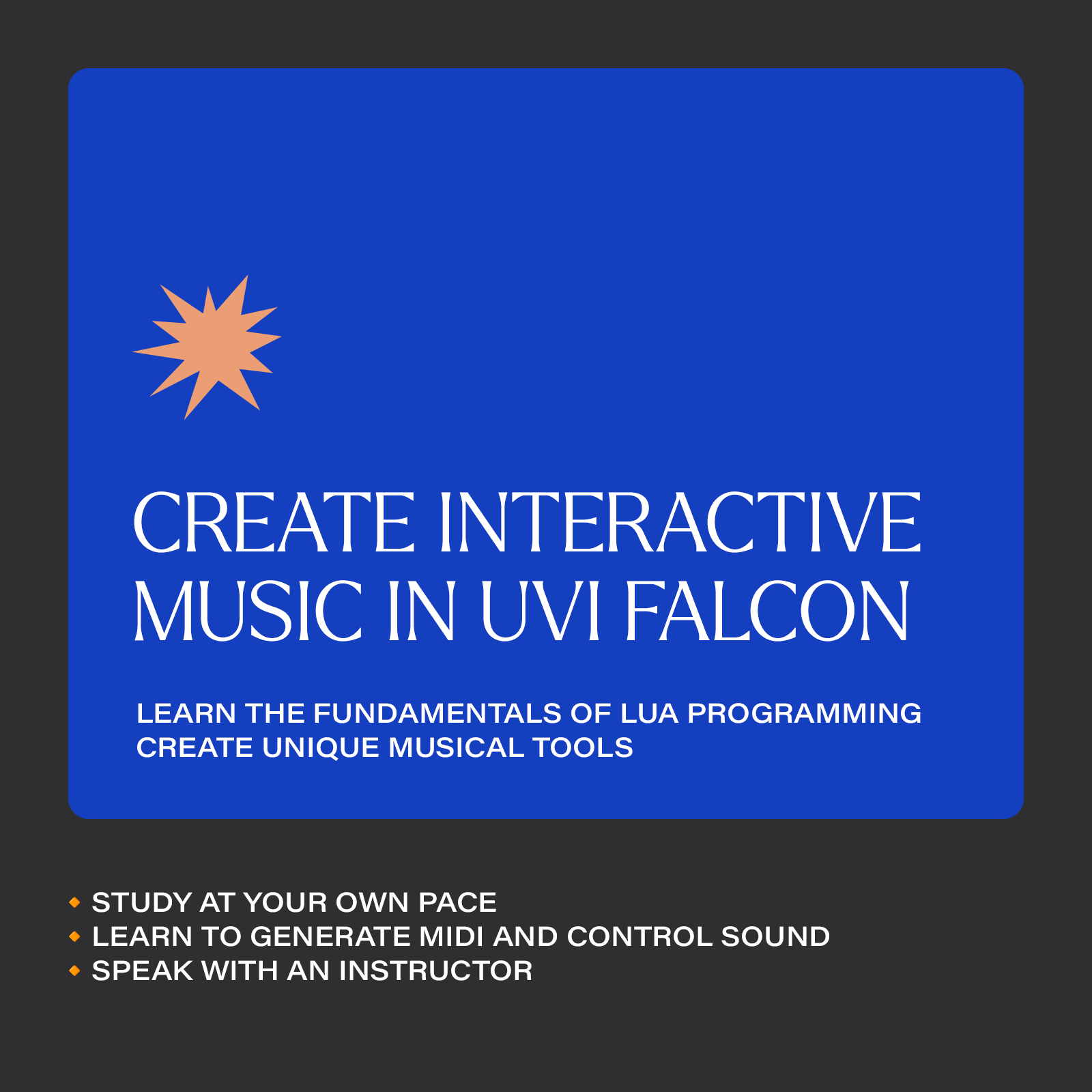 Harness the generative and creative options in UVI's Falcon with the Lua scripting language. This course is aimed towards beginners and will introduce many musicians to the deeper features of the amazing music software.